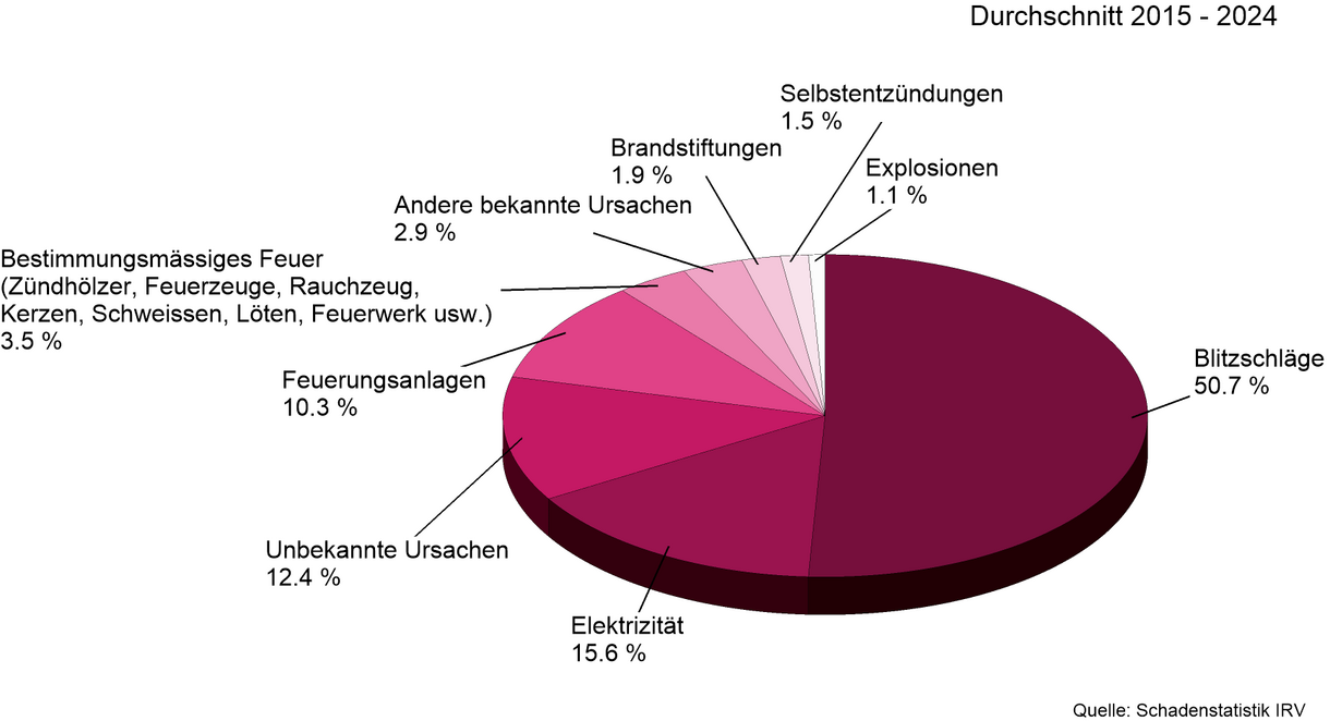 Die statistische Auswertung über einen Zeitraum der letzten zehn Jahre zeigt, dass die Brandursachen sehr vielfältig sind. Sie reichen von Blitzschlag über Feuerungsanlagen bis hin zur Selbstentzündung von Heu.
