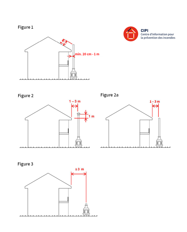 - Si la cheminée est à une distance d’au moins 20 cm et jusqu’à 1 m par rapport au bâtiment, elle doit être prolongée en hauteur jusqu’à dépasser d’un mètre le chéneau (figure 1).