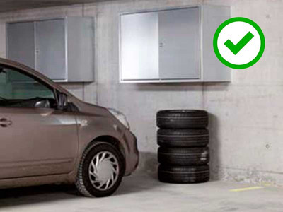 - Les prescriptions de protection incendie autorisent en principe l’entreposage de pneus dans des garages souterrains non publics jusqu’à 600 m2. Une réglementation spécifique s'applique seulement pour les entrepôts de pneus à partir d’une tonne ou à partir de 10 m2. Dans certaines circonstances, cependant, la gérance immobilière ou le propriétaire peuvent fixer leurs propres règles.